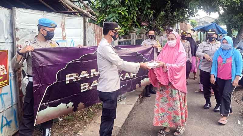EksNews | Jajaran Kepolisian Sektor (Polsek) Metro Pamulang, Kota Tangerang Selatan, Banten, membagikan takjil (hidangan buka puasa) untuk warga yang terdampak krisis ekonomi akibat Covid-19 di kawasan kumuh (slum area). Rombongan Polsek yang dipimpin langsung Kapolsek Komisaris Polisi Sujarwo SH MH itu membagikan takjil di sepanjang koridor Jalan Akasia RT 03 RW 18 tembusan ke arah Jalan Pinang Jaya dekat tol yang melintas kawasan Kelurahan Pamulang Timur, pada Senin, 10/5/21 menjelang magrib, saat buka puasa tiba.
