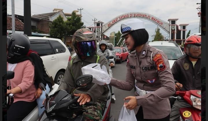 EKSNEWS.ID | Sukoharjo – Ratusan paket takjil dibagikan Polwan Polres Sukoharjo kepada para pengendara yang melintas di Jalan Simpang Patung Jamu Bulakrejo, Jumat (24/03/2023) sore.